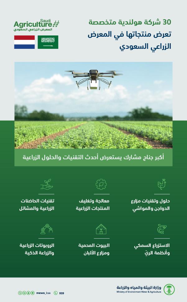 تشارك مملكة هولندا بأكبر جناح خلال المعرض الزراعي السعودي في دورته الـ(40) خلال الفترة من (23-26) أكتوبر الجاري في مركز الرياض الدولي للمعارض والمؤتمرات، وذلك بـ(30) شركة متخصصة تغطي جميع مجالات القطاع الزراعي.