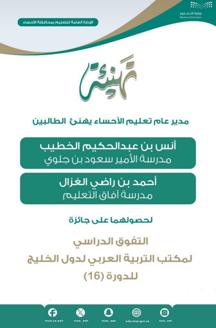 كرّم مكتب التربية العربي لدول الخليج طالبين من الإدارة العامة للتعليم بالأحساء في حفل جائزة "التفوّق الدراسي لطلبة التعليم العام" في دورته 16 والذي استضافته سلطنة عمان "مسقط".