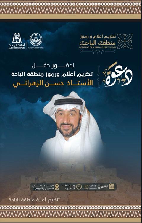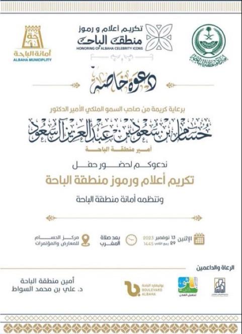 برعاية صاحب السمو الملكي الأمير الدكتور حسام بن سعود بن عبدالعزيز آل سعود، أمير منطقة الباحة، تنظم أمانة منطقة الباحة، يوم الاثنين 29 ربيع الآخر 1445هـ، الموافق 13 نوفمبر 2023م، في قاعة الحسام للمؤتمرات والمعارض، حفل تكريم لعدد من رموز وأعلام منطقة الباحة كفاء ما قدموا من أعمال ومنجزات.