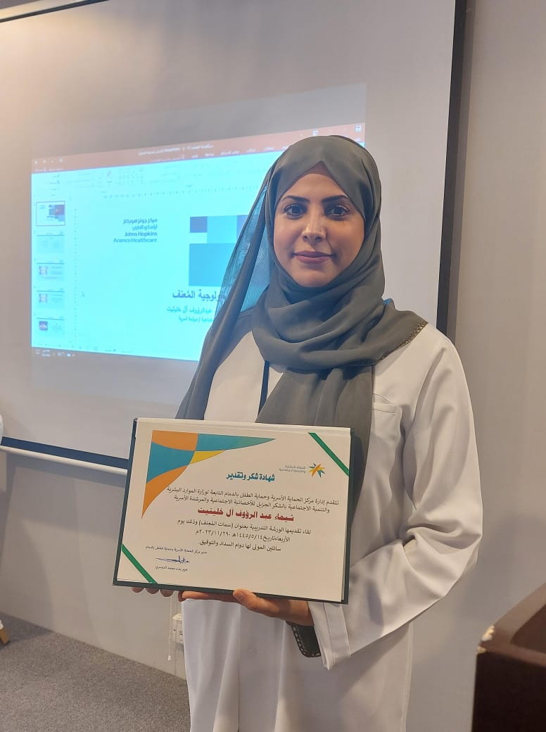 نظم قسم التدريب والتطوير بمركز الحماية الاسرية وحماية الطفل بالدمام وبالشراكة مع مركز جون هوبكنز ورشة تدريبية ( سيكلوجية المُعنف ) اليوم و بإشراف من مديرة المركز عبير الدوسري ، قدم الورشةالتدريبية الاخصائية الاجتماعية والمرشدة الاسرية شيماء بنت عبدالرؤوف ال خليتيت تحدثت خلالها عن معايير السواء و للاسواء واضطرابات الشخصية واسبابها و انماط الشخصية الغير سوية وسمات الشخصية المعنفة وتشخيص الشخصية ، و الاساليب العلاجية.