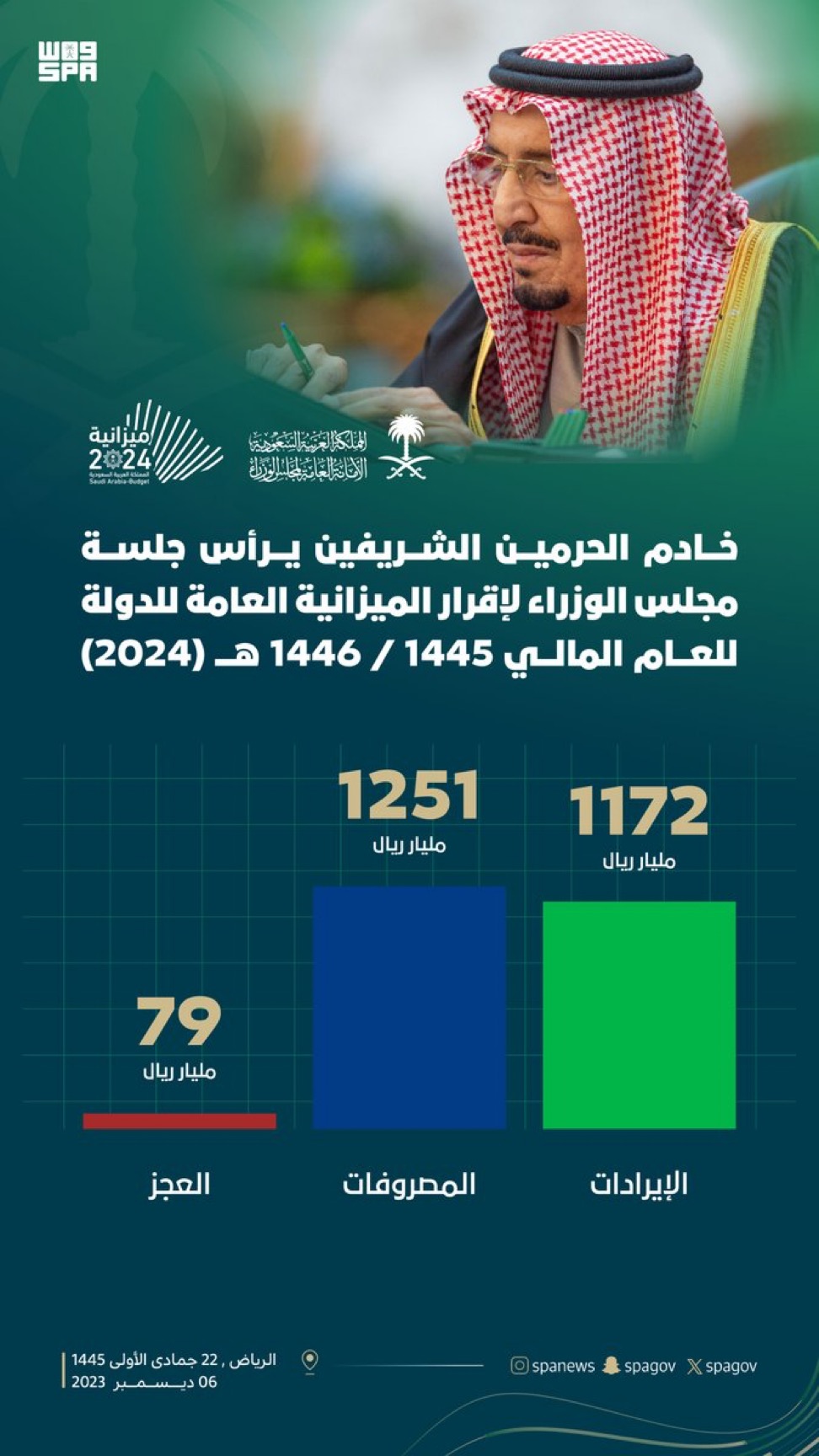 واستعرض مجلس الوزراء بنود الميزانية العامة للدولة للعام المالي 1445 / 1446 هـ (2024م)، وأصدر قراره بشأنها متضمناً ما يلي: