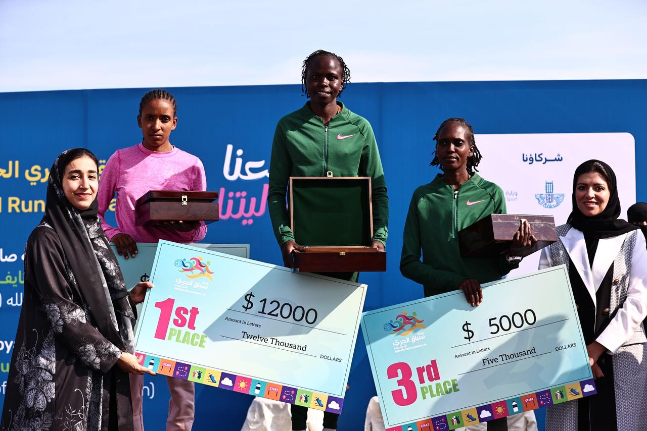 أما في الجانب النسائي فقد توجت المتسابقة «. Lilian kasait» بدرع المركز الأول وتحصلت على مبلغ (١٢٠٠٠ ) دولار فيما حلت في المركز الثاني المتسابقة «. Yenawa Kefale» وتحصلت على مبلغ (٦٠٠٠ ) دولار وجاءت المتسابقة « Irine Cheptai » في المركز الثالث متحصلة على مبلغ (5000 ) دولار ..