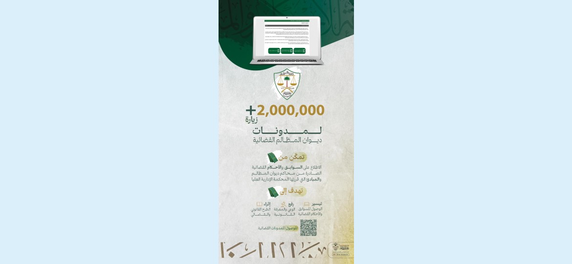 أعلن ديوان المظالم أن عدد زيارات المدونات القضائية على بوابته الرقمية بلغت 2,006,100 زيارة مُنذ إطلاقها .