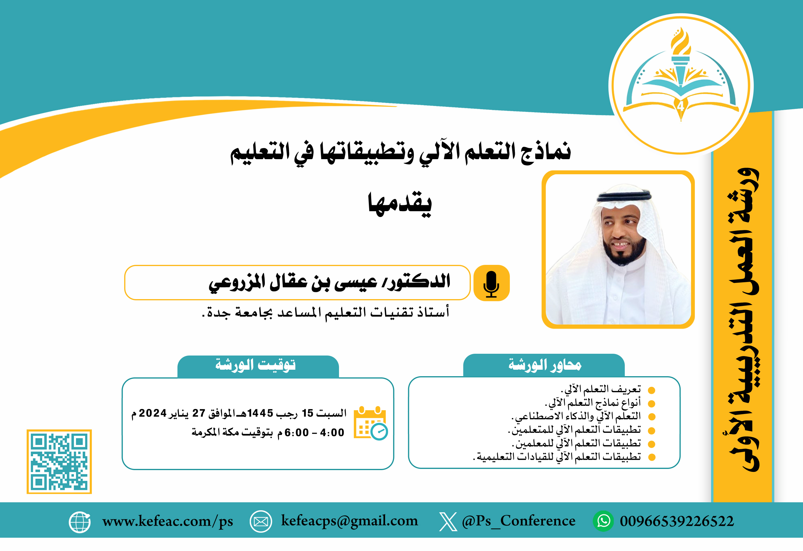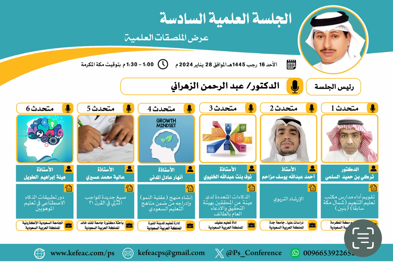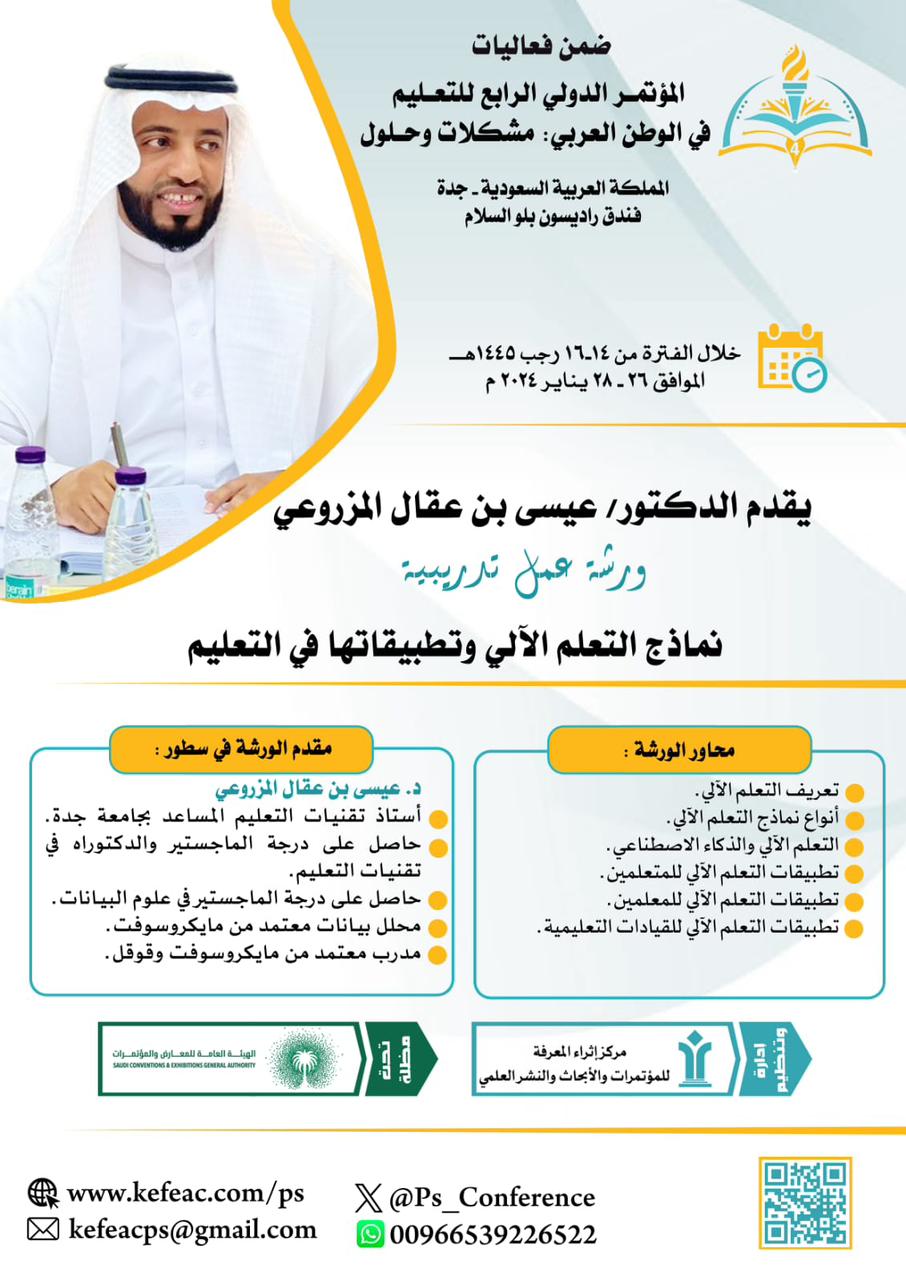 وأشار الدكتور الزهراني بان المؤتمر الدولي الرابع للتعليم في الوطن العربي يتضمن أكثر من ست جلسات علمية متنوعة العناوين والأبحاث من ضمنها جلسة علمية عن توظيف الروبوتات والذكاء الاصطناعي في التعليم، والاتجاهات الحديثة في القيادة التربوية والأكاديمية، والإعداد الأكاديمي والتطوير المهني وغيرها من الجلسات التي لا يتسع المجال لذكرها، ويشارك في كل جلسة أربعة باحثين يقومون بعرض ابحاثهم عن طريق العروض التقديمية مؤكداً بان جميع الأبحاث المشاركة في المؤتمر اجتازت معايير التحكيم، فيما يتضمن المؤتمر ورشتي عمل تدريبية الأولى يقدمها الدكتور عيسى المزروعي أستاذ تقنيات التعليم المساعد بجامعة جدة بعنوان "نماذج التعليم الآلي وتطبيقاتها في التعليم" وورشة العمل التدريبية الثانية تقدمها البروفيسور لبنى العجمي أستاذ المناهج وطرق التدريس بجامعة الملك خالد بعنوان "تدريس مهارات المستقبل".