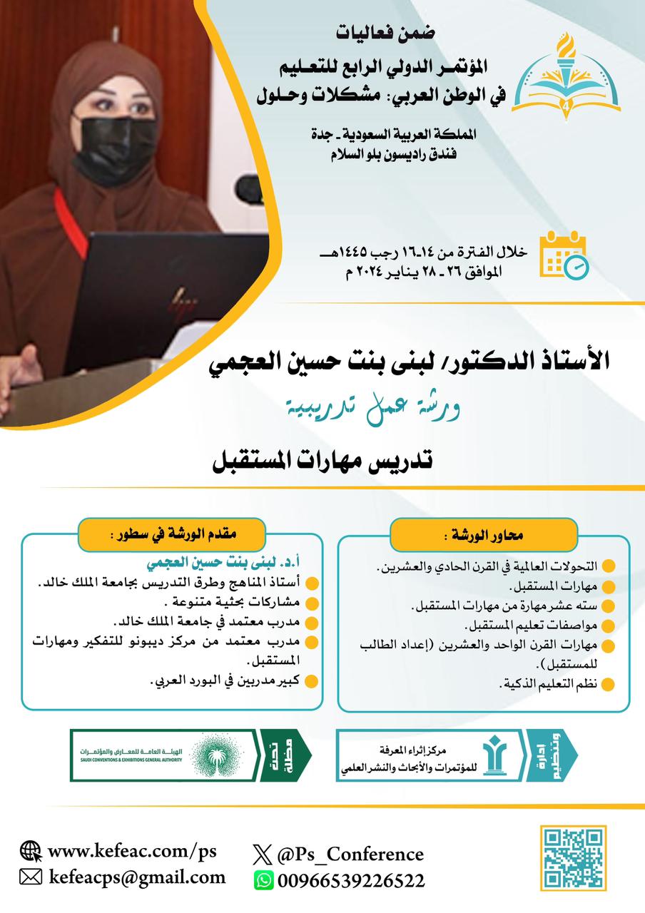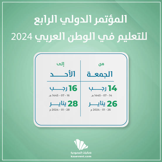تنطلق فعاليات المؤتمر الدولي الرابع للتعليم في الوطن العربي "مشكلات وحلول" في يوم السبت 15 رجب 1445هـ الموافق 27 يناير 2024م بفندق راديسون بلو السلام في مدينة جدة بمشاركة كوكبة متميزة من الأكاديميين والباحثين وطلاب الدراسات العليا من المملكة العربية السعودية ودول مجلس التعاون وبعض الدول العربية تحت مظلة الهيئة العامة للمعارض والمؤتمرات.