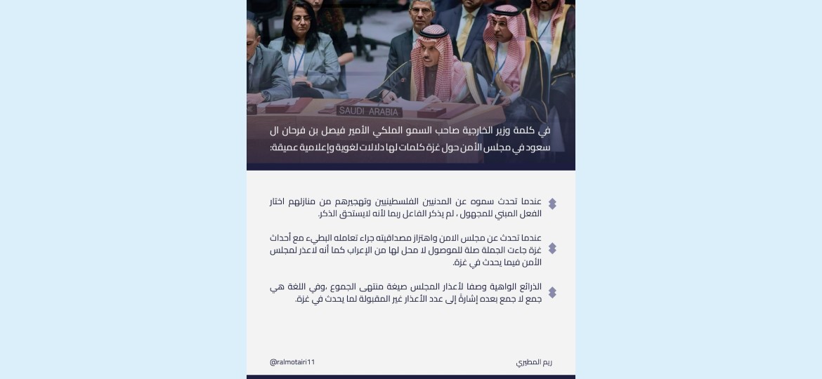 في كلمة وزير الخارجية صاحب السمو الملكي الأمير فيصل بن فرحان ال سعود في مجلس الأمن حول غزة كلمات لها دلالات لغوية وإعلامية عميقة: