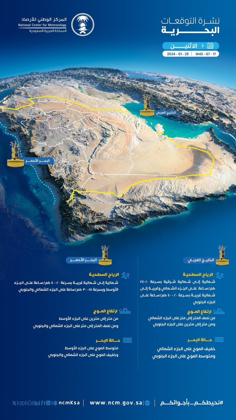 بمشيئة الله تعالى تنشط الرياح السطحية التي تحد من مدى الرؤية الأفقية على مناطق الرياض ، القصيم والأجزاء الشمالية من المنطقة الشرقية. في حين لا تزال الفرصة مهيأه لهطول أمطار خفيفة على أجزاء من مناطق الحدود الشمالية(طريف)، الجوف(القريات). كما لا يستبعد تكون الضباب على أجزاء من المنطقة الشرقية ومرتفعات عسير والباحة.