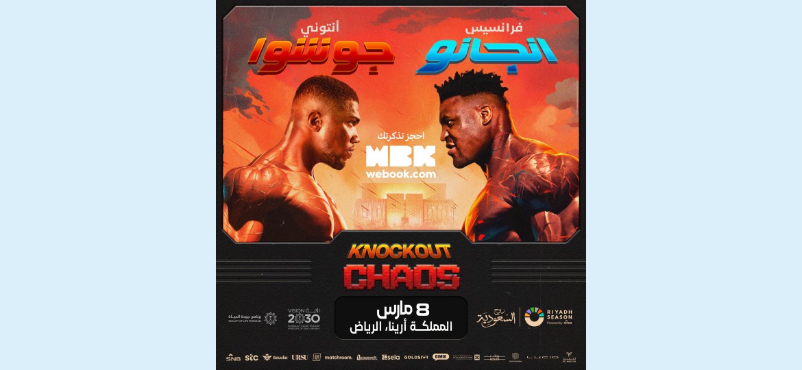 أعلن موسم الرياض إطلاق تذاكر لقاء بطل العالم السابق للوزن الثقيل أنتوني جوشوا بنظيره الفرنسي فرانسيس انجانو في مواجهة تاريخية تقام يوم 8 مارس القادم في منطقة المملكة أرينا شمال العاصمة الرياض، ويمكن حجز تذاكر اللقاء من خلال الرابط:https://webook.com/ar/events/tickets-boxing-knockout-chaos.