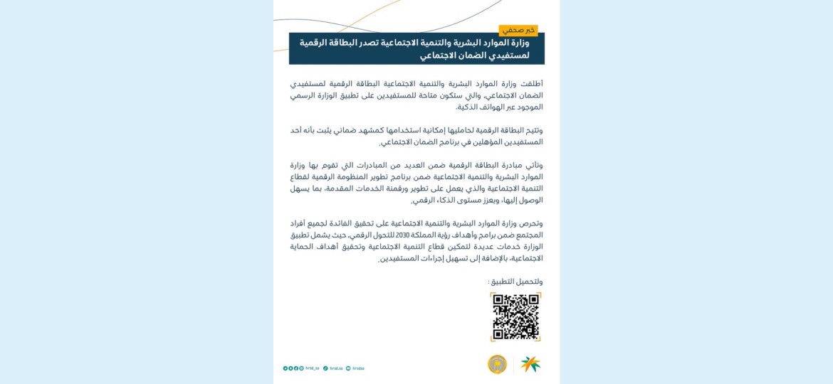 وزارة الموارد البشرية والتنمية الاجتماعية تصدر البطاقة الرقمية لمستفيدي الضمان الاجتماعي.