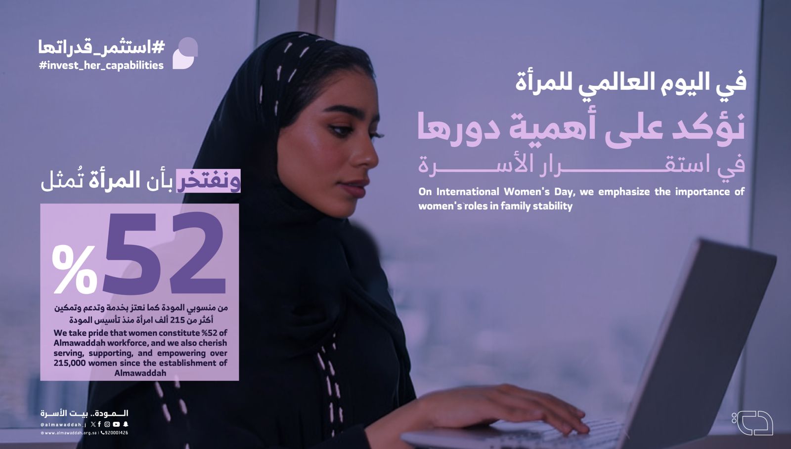 ضمن جهود جمعية المودة المستمرة في دعم وتمكين المرأة، أطلقت المودةبمناسبة اليوم العالمي للمرأة حملة تحت شعار "استثمر قدراتها" والذي يهدف إلى تعزيز استثمار قدرات المرأة لتمكينها بشكل فعال.