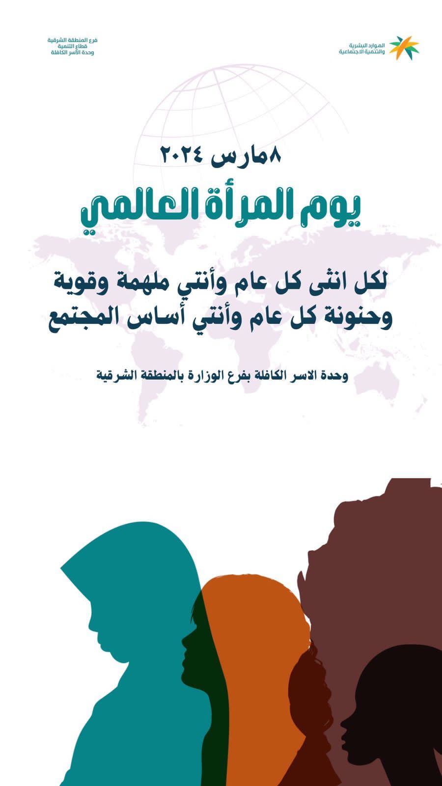 في إطار تفعيلها لليوم العالمي للمرأة، احتفت وحدة الاسر الكافلة بفرع وزارة الموارد البشرية والتنمية الاجتماعية بالمنطقة الشرقية بمنسوباتها من النساء، وبأشراف من أ منيره السرار وذلك للتعبير عن تقدير الادارة بكل مكوناتها للدور الكبير الذي تقوم به المرأة داخل الوحدة كشريك في التنمية .