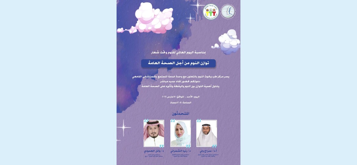 تحت شعار "توازن النوم من أجل الصحة العامة" وتزامنًا مع اليوم العالمي للنوم دعا مركز طب وبحوث النوم بالتعاون مع وحدة خدمة المجتمع بمستشفى جامعة الملك عبدالعزيز بجدة إلى حضور اللقاء المباشر الذي يتناول أهمية التوازن بين النوم واليقظة وتأثيره على الصحة العامة ، وذلك يوم الأحد المقبل السابع عشر من مارس 2024 ، من الساعة ( 11-12) مساء ، إذ يتحدث في اللقاء كل من البروفيسور سراج عمر ولي استشاري أمراض الصدر وطب النوم - جامعة الملك عبد العزيز ، الدكتورة رنيا الشمراني استشاري وطب النوم للأطفال - جامعة الملك عبد العزيز ، الدكتور وائل العمودي استشاري طب النوم - جامعة الملك عبد العزيز - رابغ.