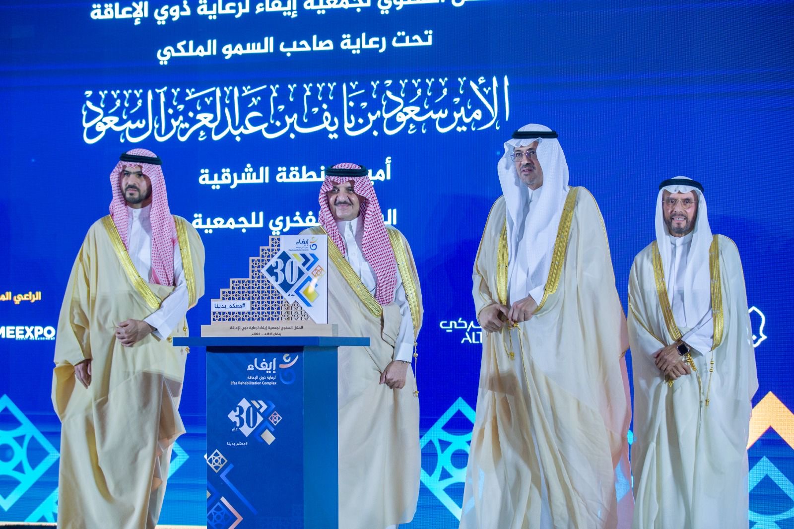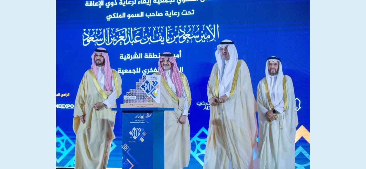 رعى صاحب السمو الملكي الأمير سعود بن نايف بن عبدالعزيز أمير المنطقة الشرقية الرئيس الفخري لجمعية إيفاء ، بحضور صاحب السمو الملكي الأمير سعود بن بندر بن عبدالعزيز نائب أمير المنطقة الشرقية احتفال جمعية إيفاء لرعاية ذوي الاعاقة مساء امس الأحد بمناسبة مرور ٣٠ عاماً على تأسيسها تحت شعار "معكم بدينا" .