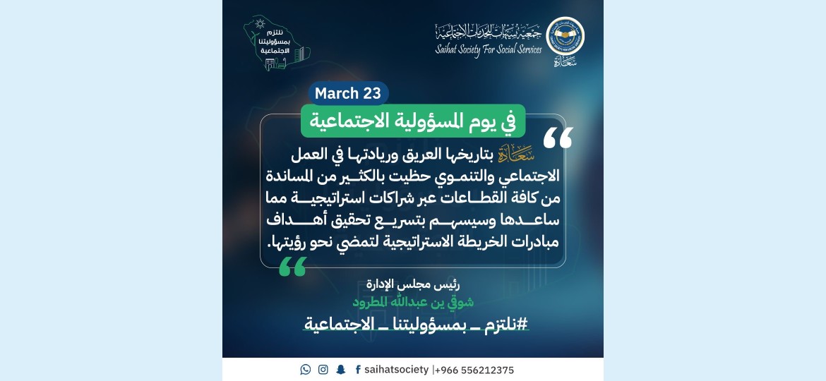 وجه الأستاذ شوقي المطرود رئيس مجلس إدارة جمعية سيهات للخدمات الاجتماعية "سعادة" شكره لجميع الداعمين والمتفاعلين وشركاء النجاح المساهمين في تحقيق أهداف "سعادة".