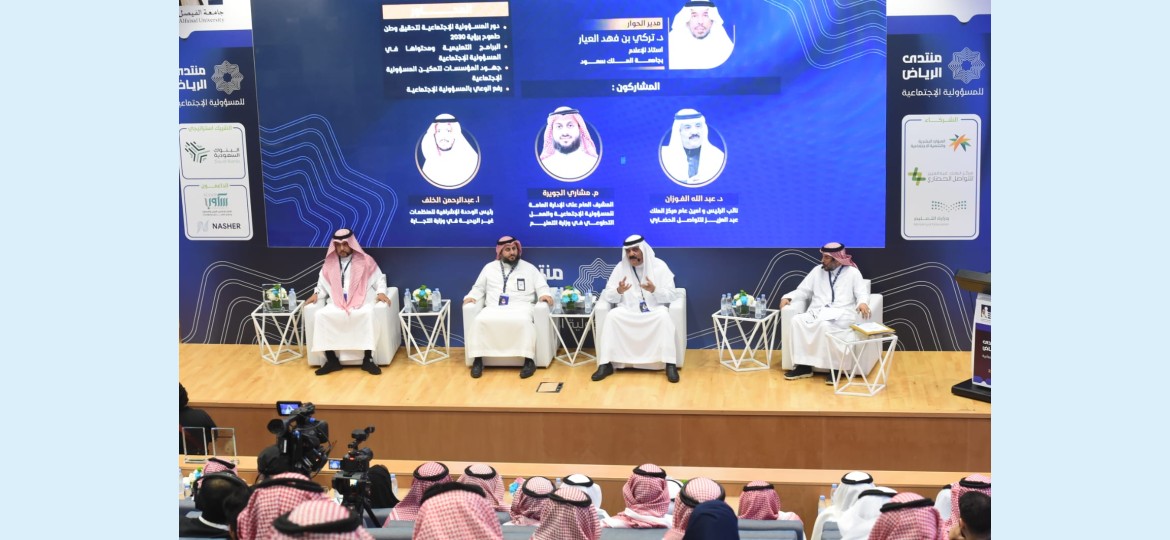 بعد ذلك ألقى الأستاذ سعود السبيعي رئيس مجلس إدارة جمعية المسؤولية المجتمعية كلمة اعرب فيها سعادته وسروره بتعاون جمعية المسؤولية المجتمعية مع جامعة الفيصل في تنظيم منتدى الرياض للمسؤولية الاجتماعية خصوصا تزامنه مع اليوم السعودي للمسؤولية الإجتماعية الذي يوافق السبت 23 مارس وهو امتداد للفعاليات المشتركة مع الجامعة والتي تعكس وتجسد بوضوح متانة العلاقة بين الطرفين والتي كانت نتاج مذكرة التعاون الموقعة مع الجامعة وأشار الأستاذ السبيعي إلى جهود الجمعية في مجال المسؤولية المجتمعية كونها اول جمعية مختصة ومهتمة في هذا المجال ومن ابرزها تنظيم ملتقى المسؤولية الاجتماعية والهاكثون بنسختيه الأولى والثانية وغيرها من المبادرات والفعاليات والبرامج التي تواكب مستهدفات رؤية المملكة المستقبلية الطموحة 2030.