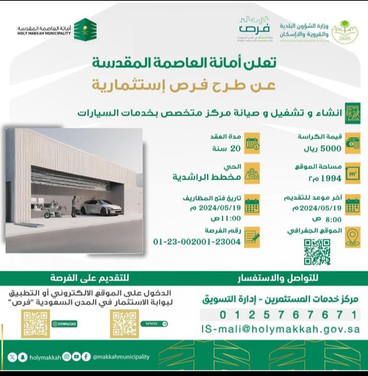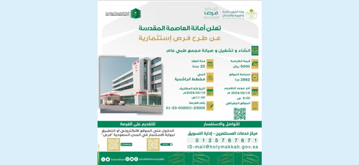 طرحت أمانة العاصمة المقدسة عدد من الفرص الاستثمارية في مواقع متفرقة بمكة المكرمة وعبر نماذج متنوعة ، وذلك ضمن جهود الأمانة لإشراك القطاع الخاص في عملية التنمية التي تتطلب عروض فنية وخبرات تأهيلية لضمان جودتها ونوعيتها وقدرة المستثمرين على الإنجاز.
