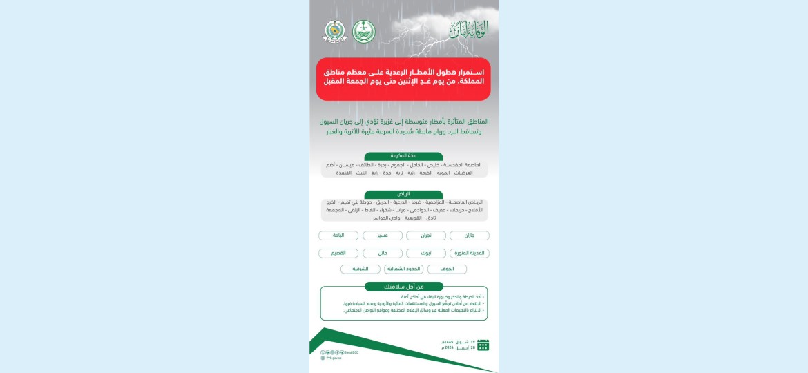 وأوضحت أن منطقة مكة المكرمة ستتأثر بأمطار متوسطة إلى غزيرة تؤدي إلى جريان السيول وتساقط البرد ورياح هابطة شديدة السرعة مثيرة للأتربة والغبار، تشمل العاصمة المقدسة وخليص والكامل والجموم وبحرة والطائف وميسان وأضم والعرضيات والمويه والخرمة ورنية وتربة وجدة ورابغ والليث والقنفذة، ومنطقة الرياض لتشمل الرياض العاصمة والمزاحمية وضرما والدرعية والحريق وحوطة بني تميم والخرج والأفلاج وحريملاء وعفيف والدوادمي ومرات وشقراء والغاط والزلفي والمجمعة وثادق والقويعية ووادي الدواسر وخفيفة إلى متوسطة على السليل ووادي الدواسر.