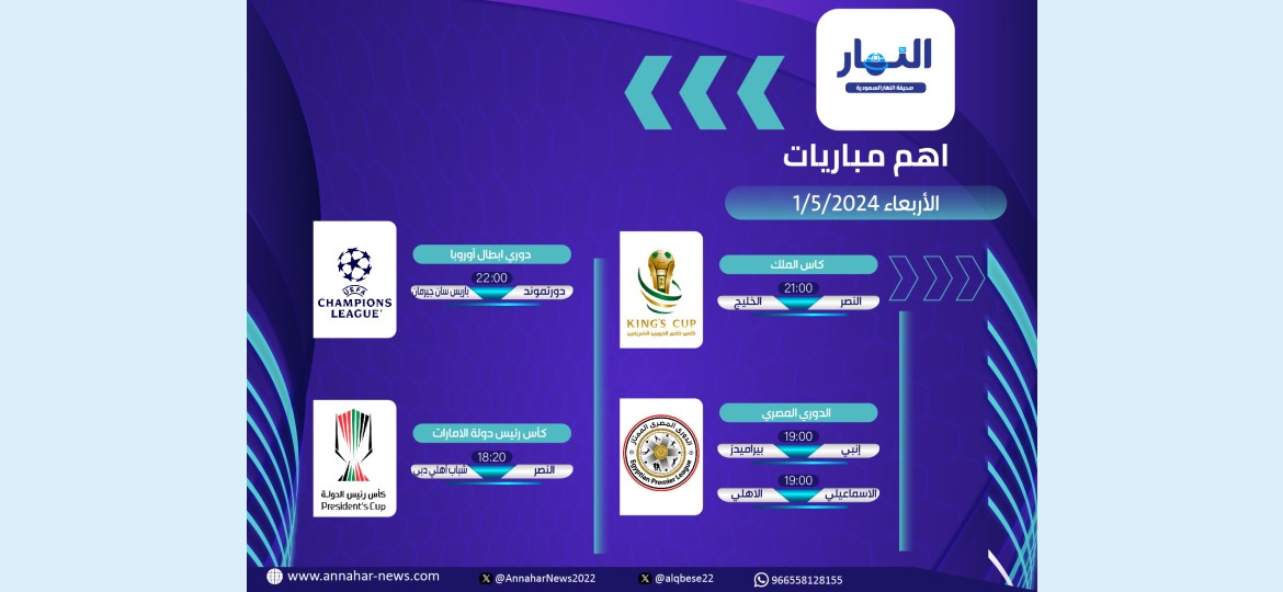 يستضيف النصر الخليج في دور الاربعة لكاس الملك ، ويسعى النصر لتعويض اخفاقاته في الدوري والسوبر واسيا بحصد كاس الملك ، فيما يريد الخليج تحقيق انجاز بوصوله للنهائي .