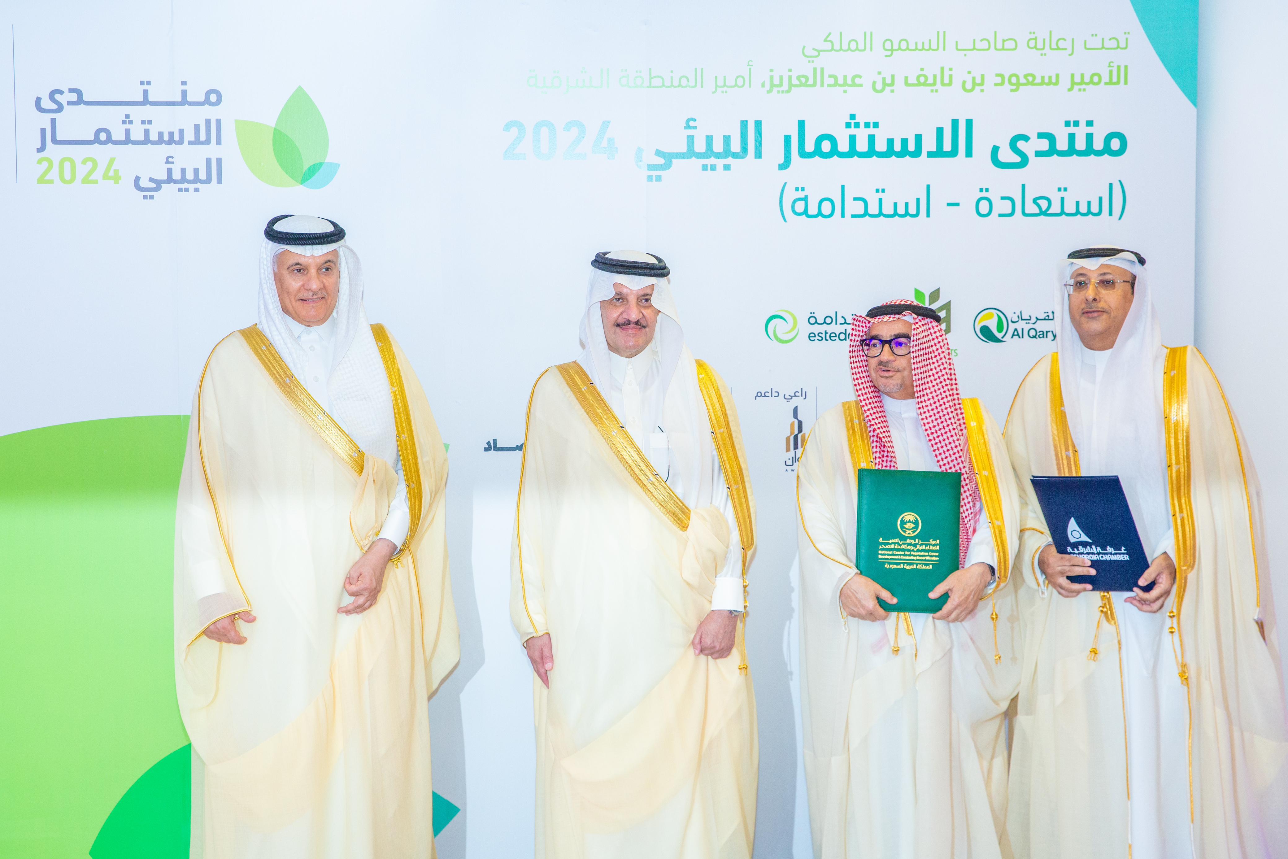 وكرم سمو أمير المنطقة الشرقية الرعاة والداعمين للمنتدى، وتجول سموه في أرجاء المعرض المصاحب وشهد توقيع ثلاث اتفاقيات الأولى: بين هيئة تطوير المنطقة الشرقية والمركز الوطني لتنمية الغطاء النباتي ومكافحة التصحر، والثانية: بين المركز الوطني لتنمية الغطاء النباتي ومكافحة التصحر وجمعية أصدقاء البيئة، والثالثة: بين غرفة الشرقية وجمعية أصدقاء البيئة، واستمع سموه خلال جولته إلى شرح من رئيس الغرفة، بدر بن سليمان الرزيزاء، حول المنتدى وأهدافه وأبرز محاوره.