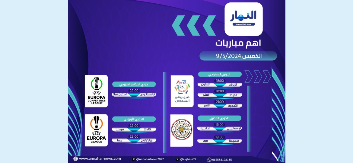 تنطلق الخميس مباريات الجولة الـ 31 من الدوري السعودي بثلاث مباريات، ويُلعب نصف نهائي الدوري الأوربي ، وفيما يلي أبرز المباريات :