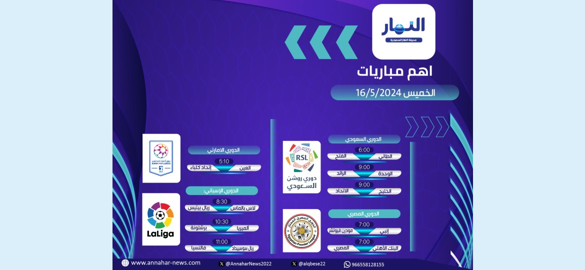 يشهد يوم الخميس الموافق 16 من مايو الجاري، العديد من المباريات على المستوى المحلي والإقليمي والدولي، والتي تتمثل في التالي:-