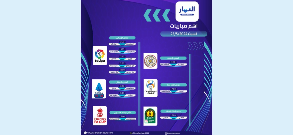 يحرص عشاق ومحبو كرة القدم على معرفة جدول مواعيد مباريات يوم السبت 25 مايو 2024م، في مختلف دوريات العالم، حيث تشهد العديد من المباريات خاصةً مع قُرب انتهاء الدوريات العالمية والعربية.